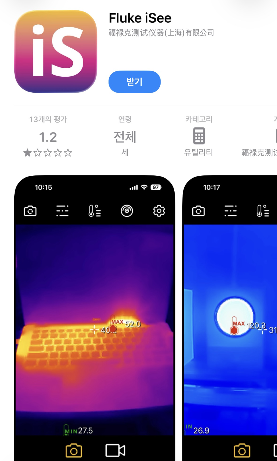 <애플 앱스토어에서 Fluke iSee 를 검색하여 다운로드>
