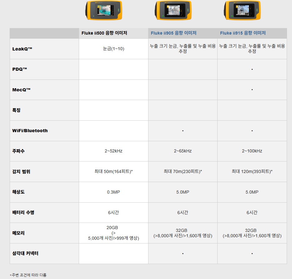 다음 표에는 Fluke 음향 카메라 간의 주요 차이점이 나와 있습니다. 전체 사양 비교 정보는 데이터 시트를 참조하십시오.